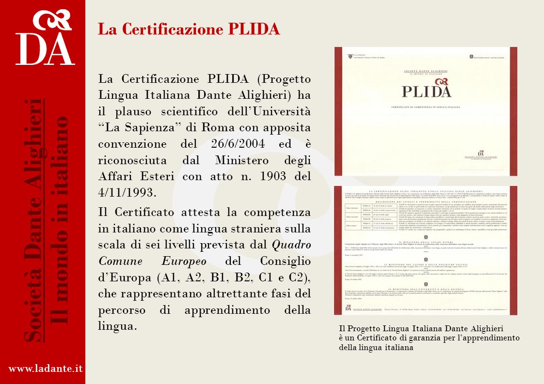 نمونه سوالات آزمون PLIDA . یکی از آزمون های معتبر با توجه به دستورالعمل های اروپا برای سنجش میزان تسلط بر زبان ایتالیایی آزمون PLIDA به معنی (Progetto Lingua Italiana Dante Alighieri) می باشد. این آزمون هرچند از سایر آزمون ها مانند چیلز و چلی از نظر اعتباری پایین تر است ولی در بین آزمون های معتبر به حساب می آید و توسط soceta dante aligieri برگزار می شود و به نفراتی که در این آزمون قبول می شوند ویزای شهروندی ایتالیا اعطا می گردد.